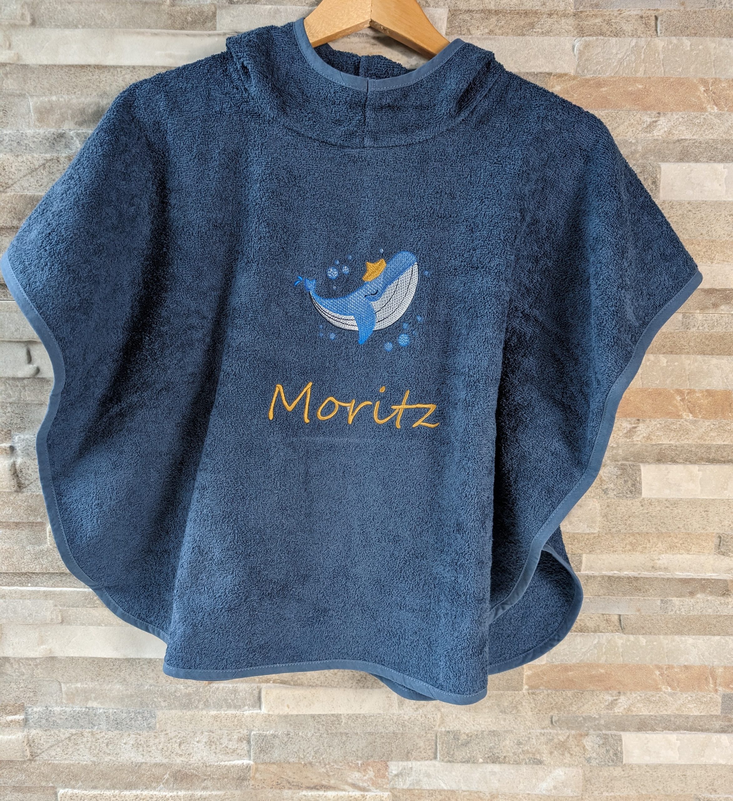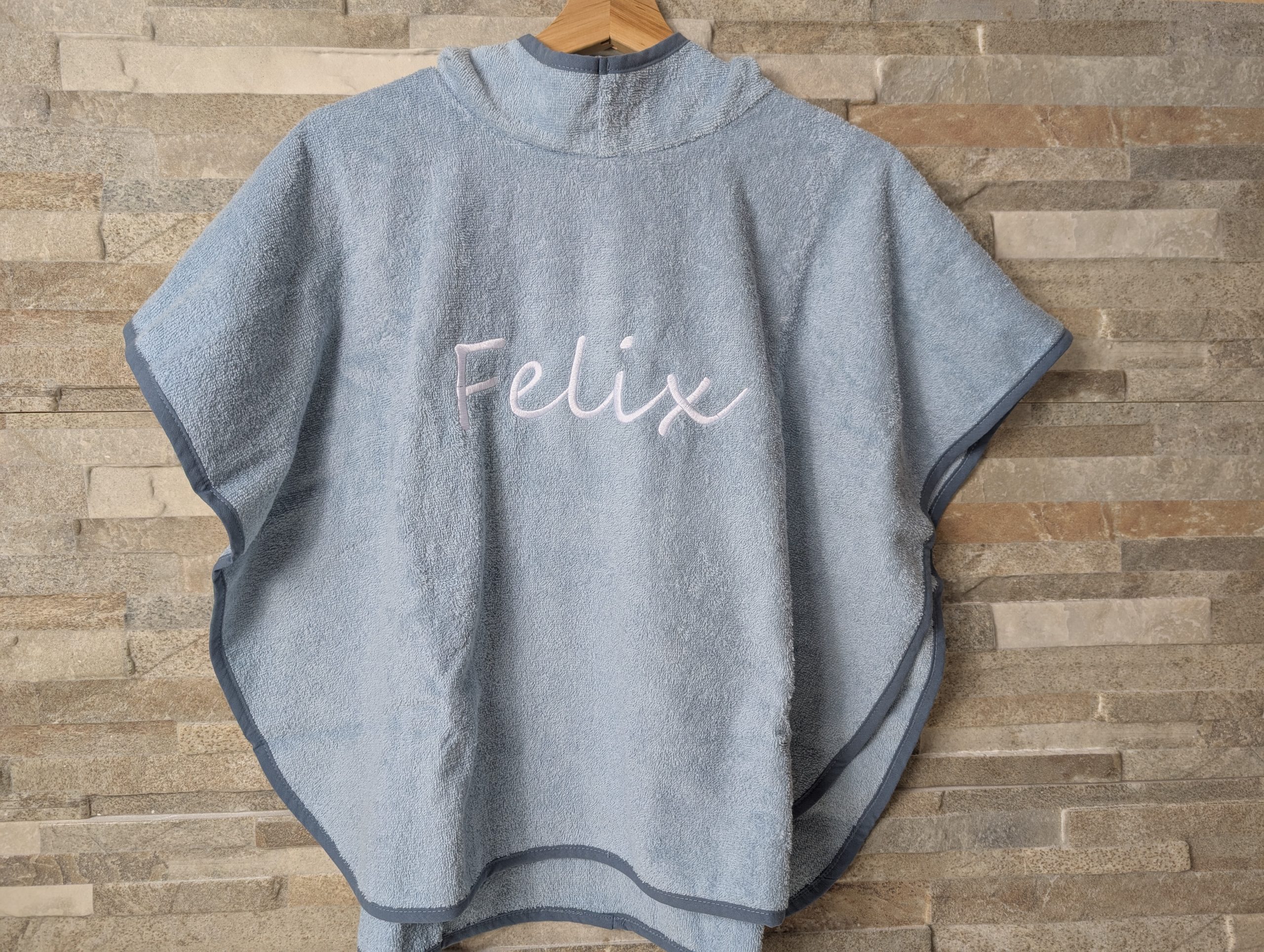 Mit dem aufgestickten Namen (auf Wunsch mit Motiv) und deinem Wunschtext wird jeder Poncho zu einem unverwechselbaren Unikat.