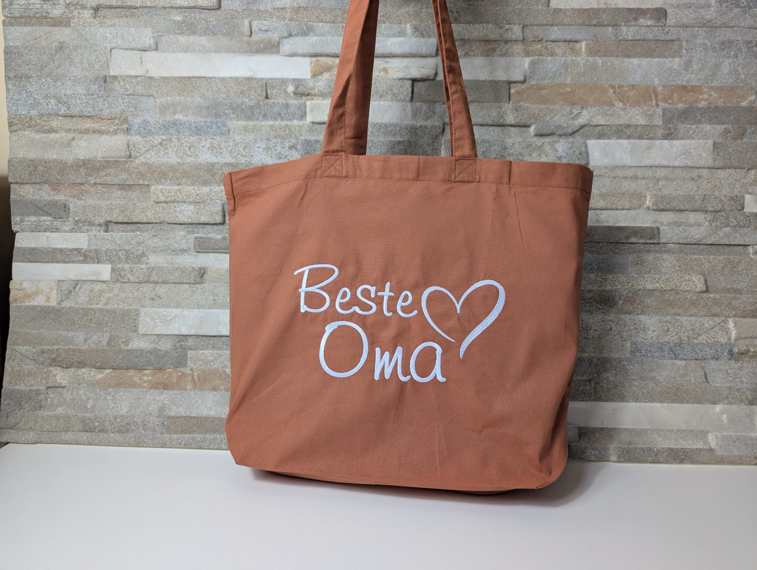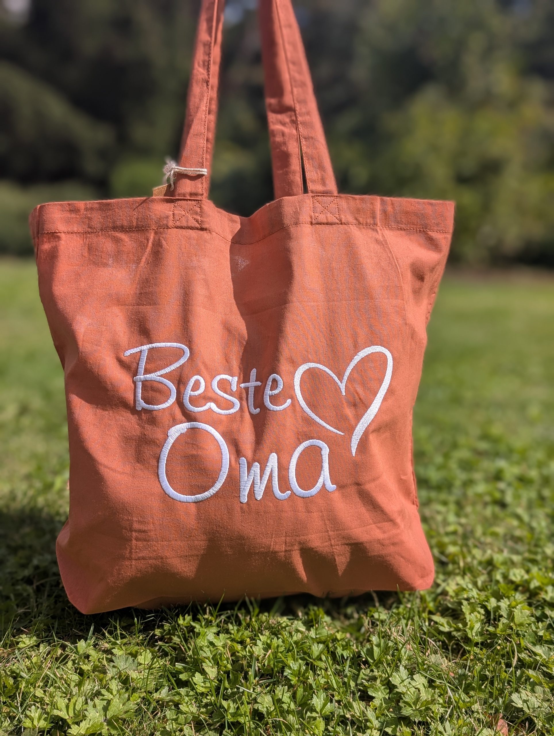 Mit dem aufgestickten „Beste Oma“-Motiv und deinem Wunschtext wird jede Tasche zu einem unverwechselbaren Unikat.