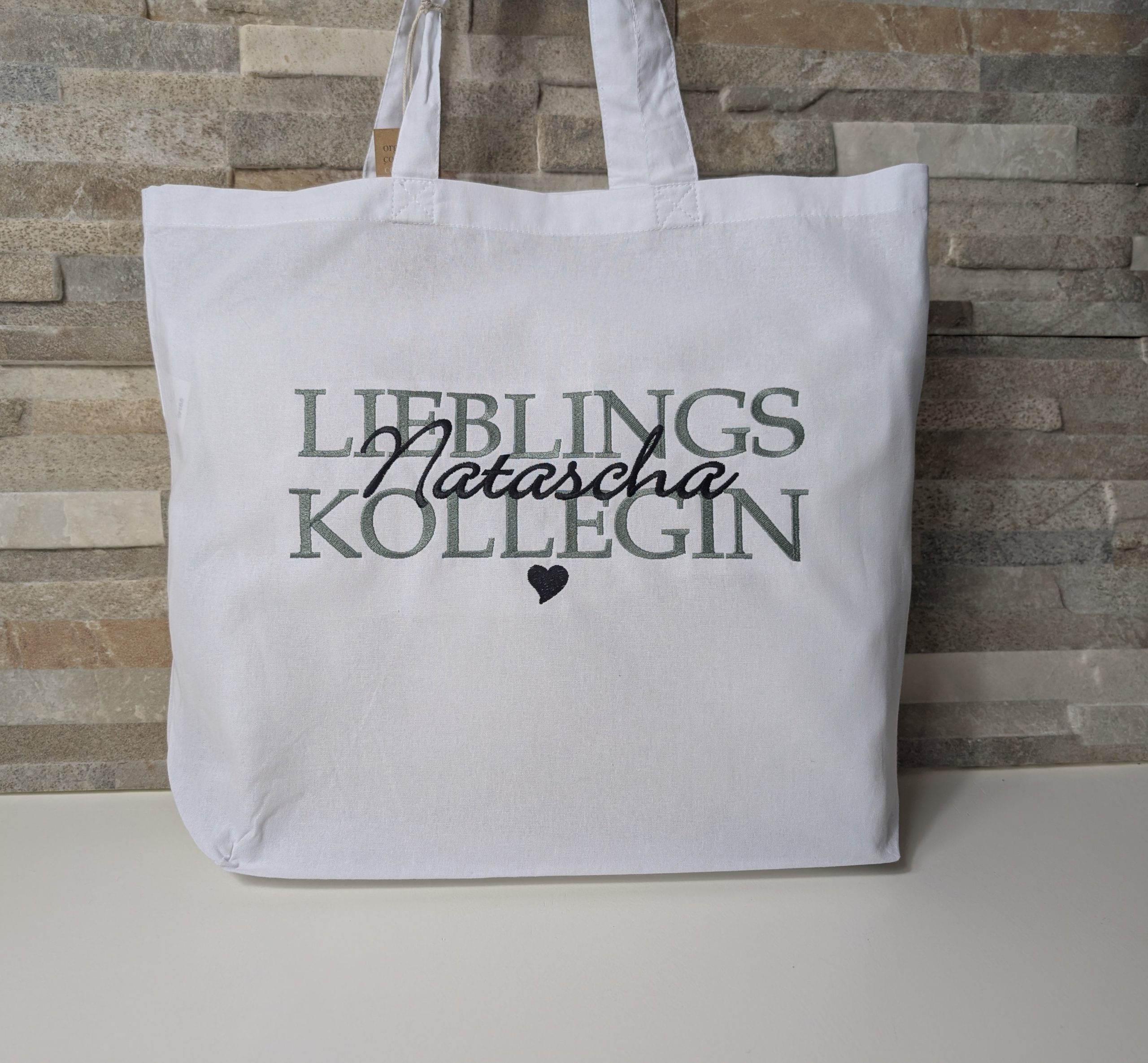 Suchst du ein wertschätzendes Geschenk für die beste Kollegin? Unsere Einkauftasche „Lieblingskollegin“ mit individueller Bestickung ist die ideale Wahl – hochwertig, persönlich und einzigartig. Ob fürs Büro, den Markt, den Wocheneinkauf oder als Team-Dankeschön – diese Tragetasche überzeugt durch robuste Qualität und eine edle Stickerei.